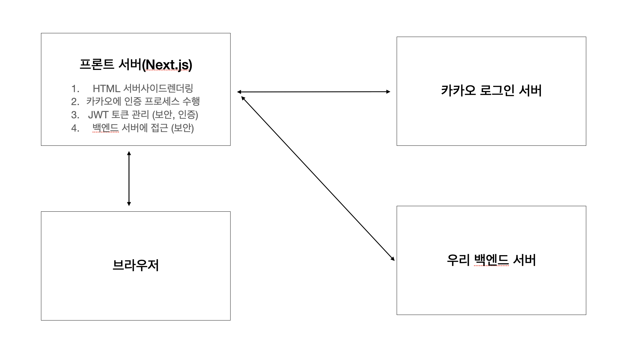 하지만 나도 확실하지 않다. 백엔드 친구도 확실하게 논파하진 못했다. 그래서 일단 이렇게 가고 해보면서 경험하기로 했다. 내가 확신하지 못하는 이유 중 하나는 이렇게 하게 되면 jwt 토큰의 시크릿키를 프론트 서버와 백엔드 서버가 사전에 공유해야 하기 때문이다. 보안에 더 취약한 구조 아닐까 싶어서이다. 그래서 나중엔 인증 서버를 독립적으로 둬야 한다고 생각하고 있다. 일단 해보면서 지속적으로 어떤 구조가 더 나은지 생각하기로 했다.