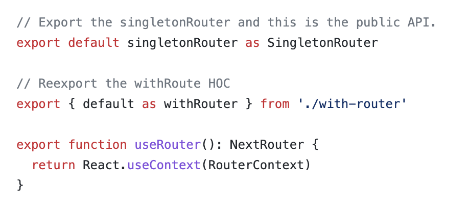 next.js의 router 내부 코드이다. 코드를 보면 useRouter와 Router가 완전히 동일함을 알 수 있다.