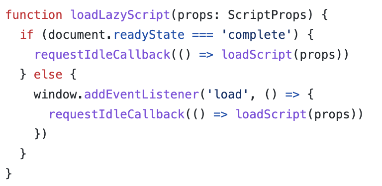 Next.js 11 버전부터 제공하고 있는 next/script 패키지를 이용하면 쉽게 구현할 수 있는데 strategy에 lazyOnload를 주게 되면 내부적으로 requestIdleCallback을 호출하게 되어있다.