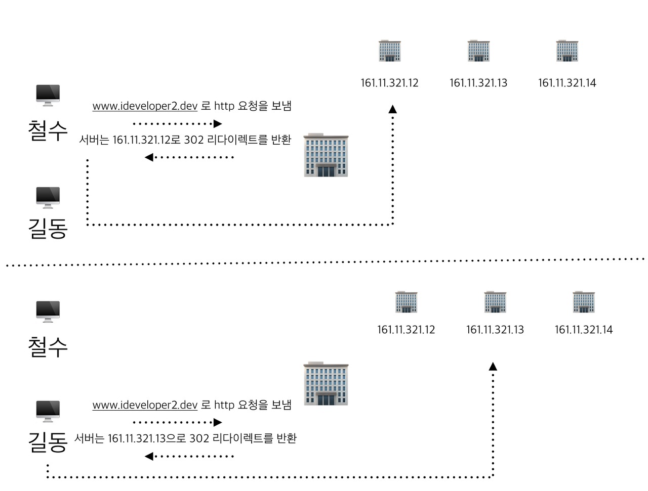 - 어떤 서버로 리다이렉트 할지 결정하려면 원 서버는 상당히 많은 처리를 해야함. (때로는 거의 페이지 자체를 제공할 때 필요한 양과 같은양의 처리 필요)