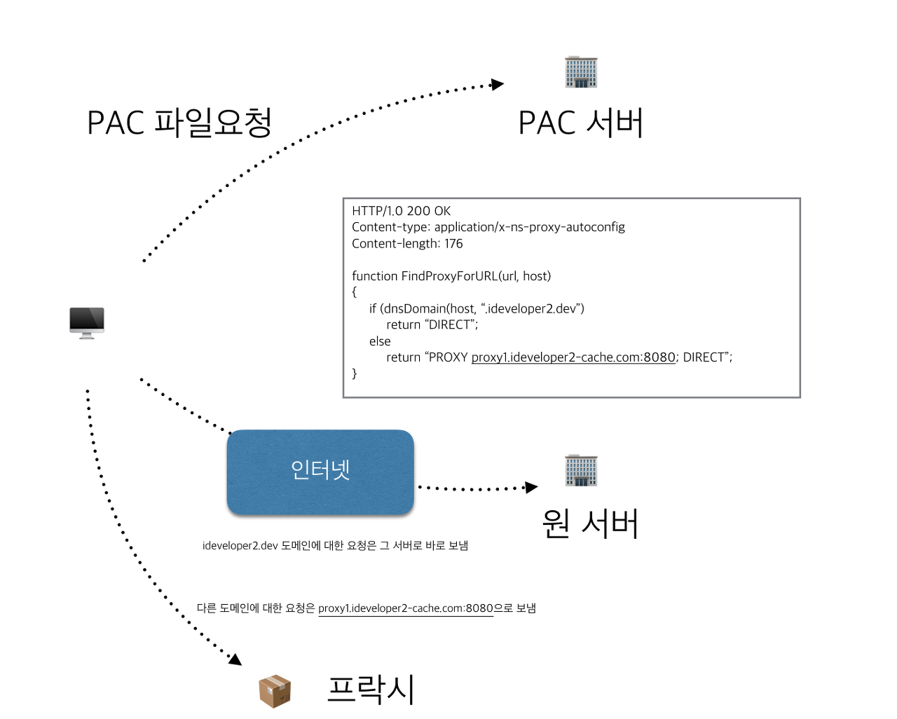 - 올바른 프락시 서버에 접촉하기 위해 브라우저가 동적으로 자신을 설정할수 있게 하는 방식. 이를 프락시 자동설정(Proxy Auto-configuration, PAC) 프로토콜이라고 부릅니다.
